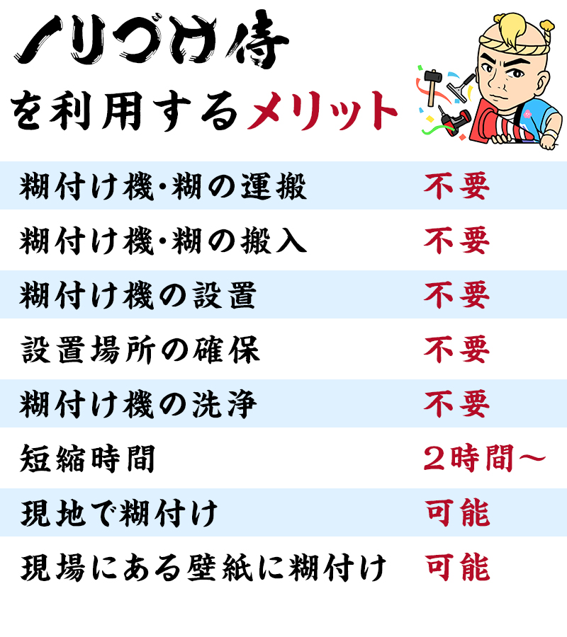 『ノリづけ侍』は、職人さんの負担をゼロにする現地壁紙糊付けサービスです。